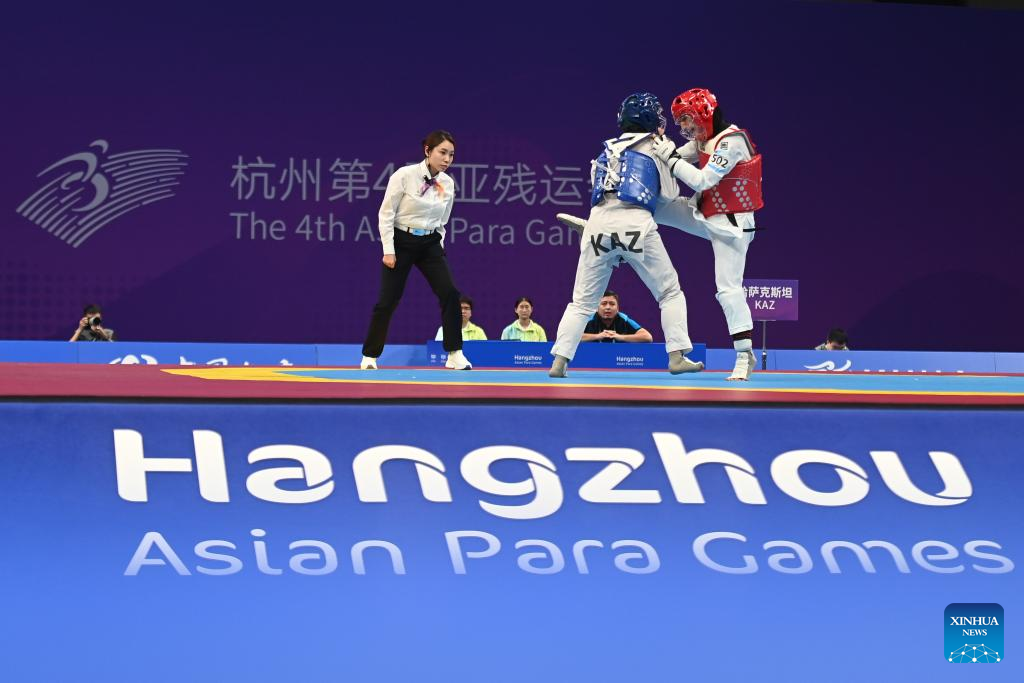 Iran's Roza Ebrahimi (R) competes against Kazakhstan's Kamilya Dosmalova during their Women's K44 57KG Gold Medal Contest of Taekwondo at the 4th Asian Para Games in Hangzhou, east China's Zhejiang Province, Oct. 24, 2023. (Xinhua/Huang Zongzhi)