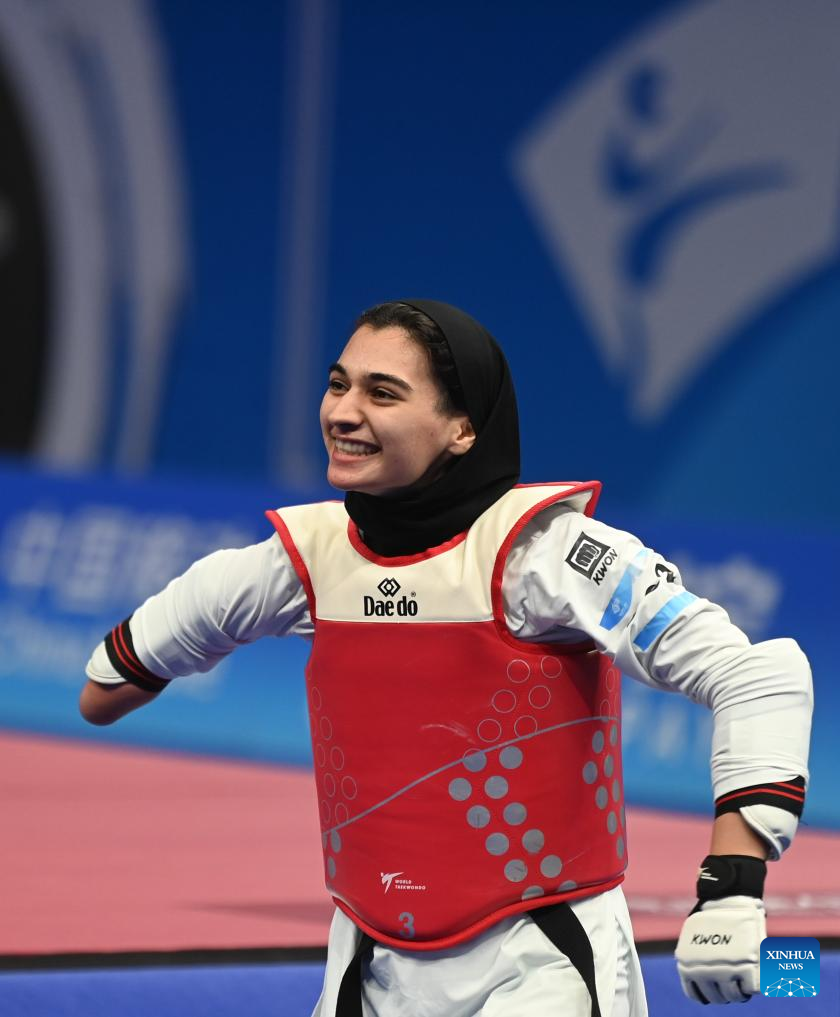 Iran's Roza Ebrahimi celebrates after winning the Women's K44 57KG Gold Medal Contest of Taekwondo against Kazakhstan's Kamilya Dosmalova at the 4th Asian Para Games in Hangzhou, east China's Zhejiang Province, Oct. 24, 2023. (Xinhua/Huang Zongzhi)