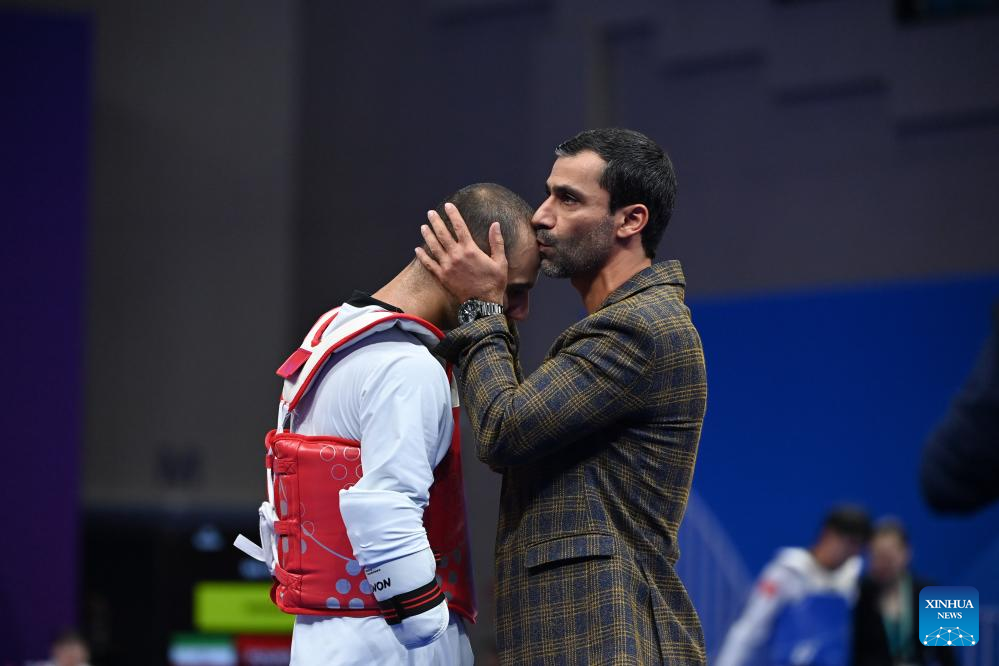 Iran's Mahdi Pourrahnamaahmadgourabi (L) celebrates after winning the Men's K44 70KG Gold Medal Contest of Taekwondo against China's Chen Shihe at the 4th Asian Para Games in Hangzhou, east China's Zhejiang Province, Oct. 24, 2023. (Xinhua/Huang Zongzhi)