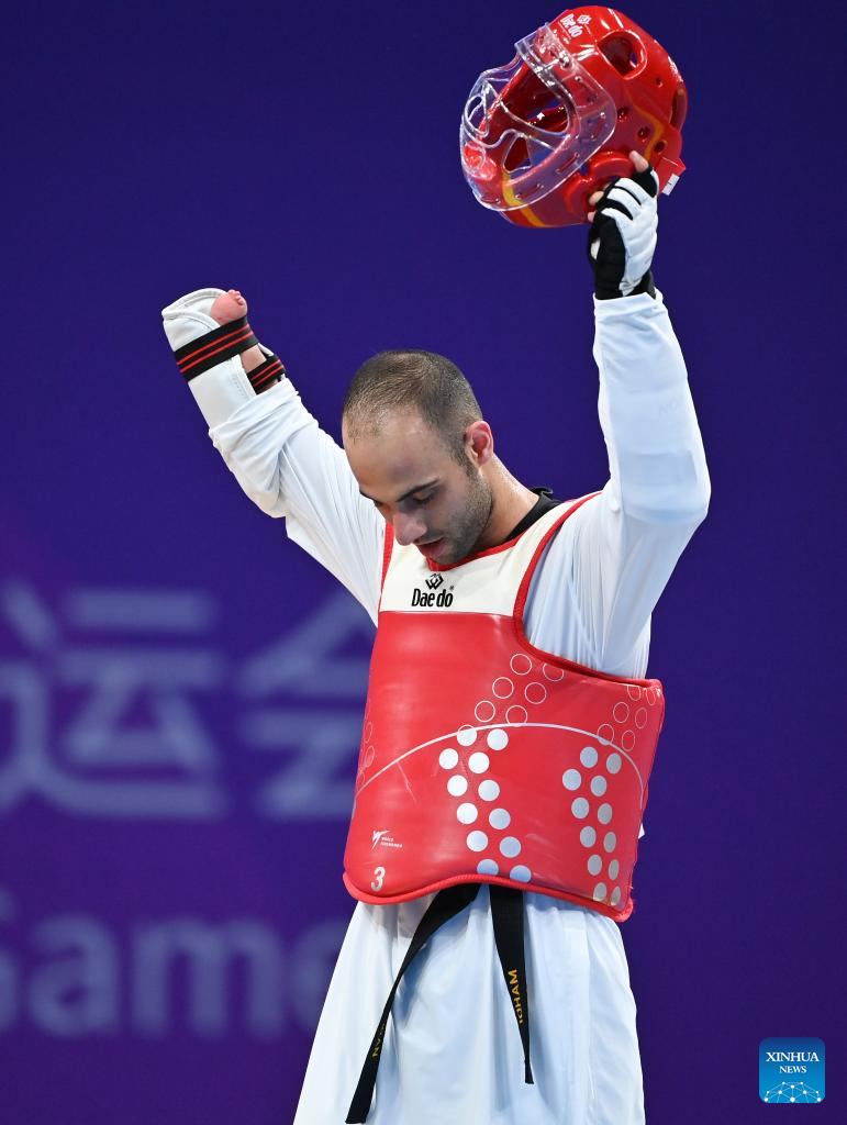 Iran's Mahdi Pourrahnamaahmadgourabi celebrates after winning the Men's K44 70KG Gold Medal Contest of Taekwondo against China's Chen Shihe at the 4th Asian Para Games in Hangzhou, east China's Zhejiang Province, Oct. 24, 2023. (Xinhua/Huang Zongzhi)