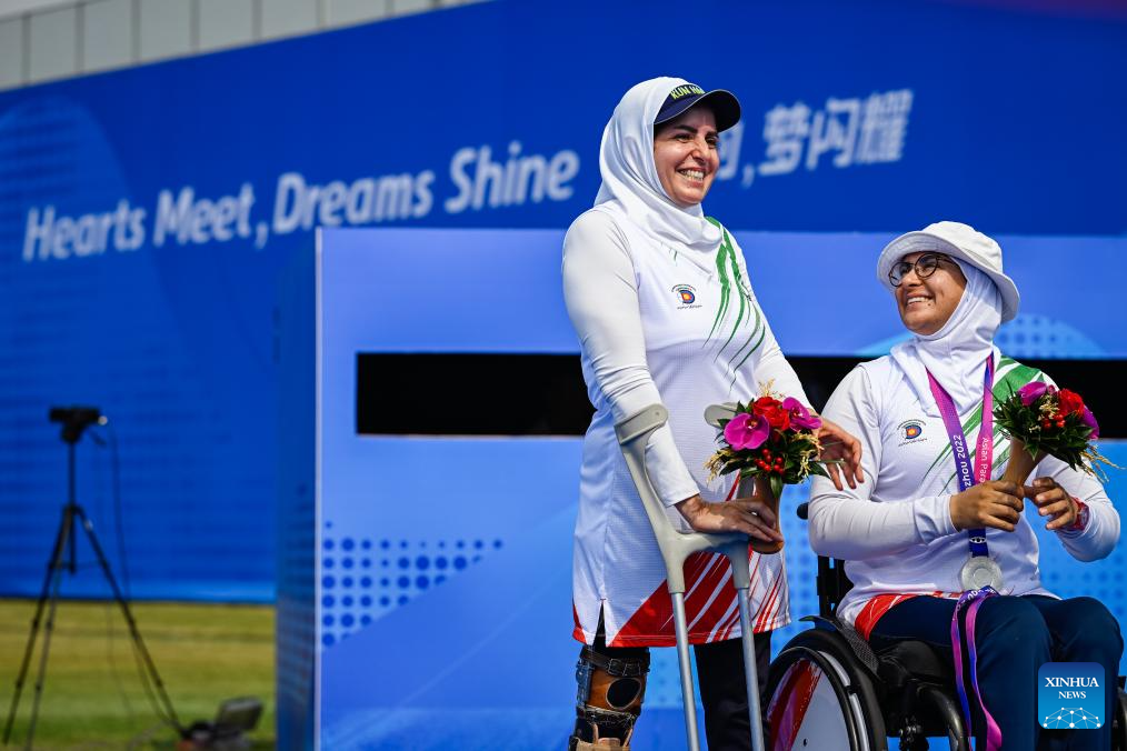 Zahra Nemati (R)/Somayeh Rahimi Ghahderijani of Iran pose after the Women's Doubles Recurve Open Gold Medal Match of Archery between Wu Chunyan/Wu Yang of China and Zahra Nemati/Somayeh Rahimi Ghahderijani of Iran at the 4th Asian Para Games in Hangzhou, east China's Zhejiang Province, Oct. 25, 2023. (Xinhua/Wu Zhizun)