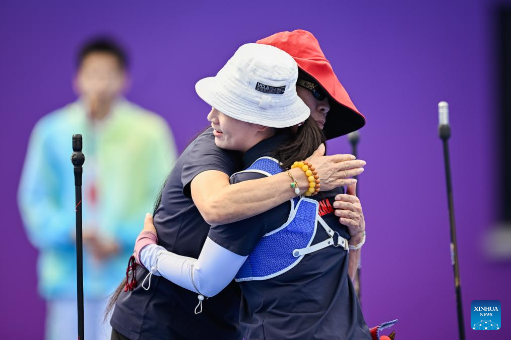 Wu Yang (front) of China hugs her coach after the Women's Doubles Recurve Open Gold Medal Match of Archery between Wu Chunyan/Wu Yang of China and Zahra Nemati/Somayeh Rahimi Ghahderijani of Iran at the 4th Asian Para Games in Hangzhou, east China's Zhejiang Province, Oct. 25, 2023. (Xinhua/Wu Zhizun)