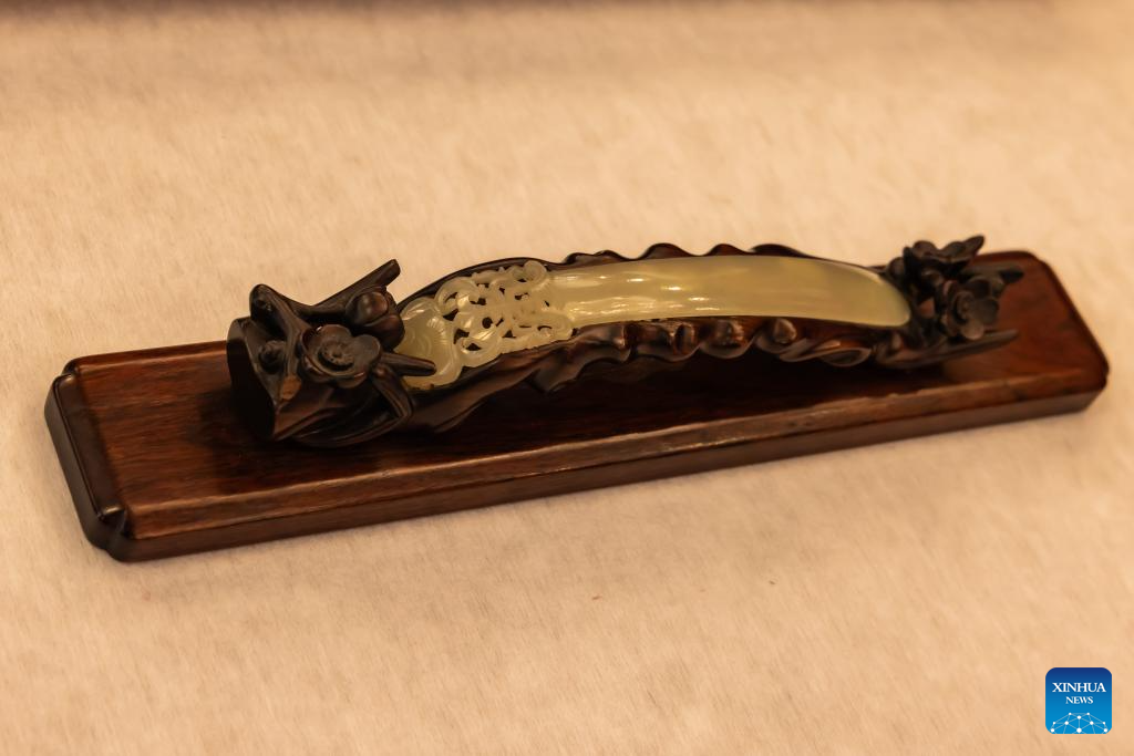 A hairpin with a jade inlaid from the Qing Dynasty is displayed at a handover ceremony for the repatriation of Chinese cultural objects at the Chinese embassy in Australian capital Canberra, Oct. 25, 2023. The ceremony witnessed five objects back to China. Among them, three are returned by the Australian government. (Photo by Chu Chen/Xinhua)
