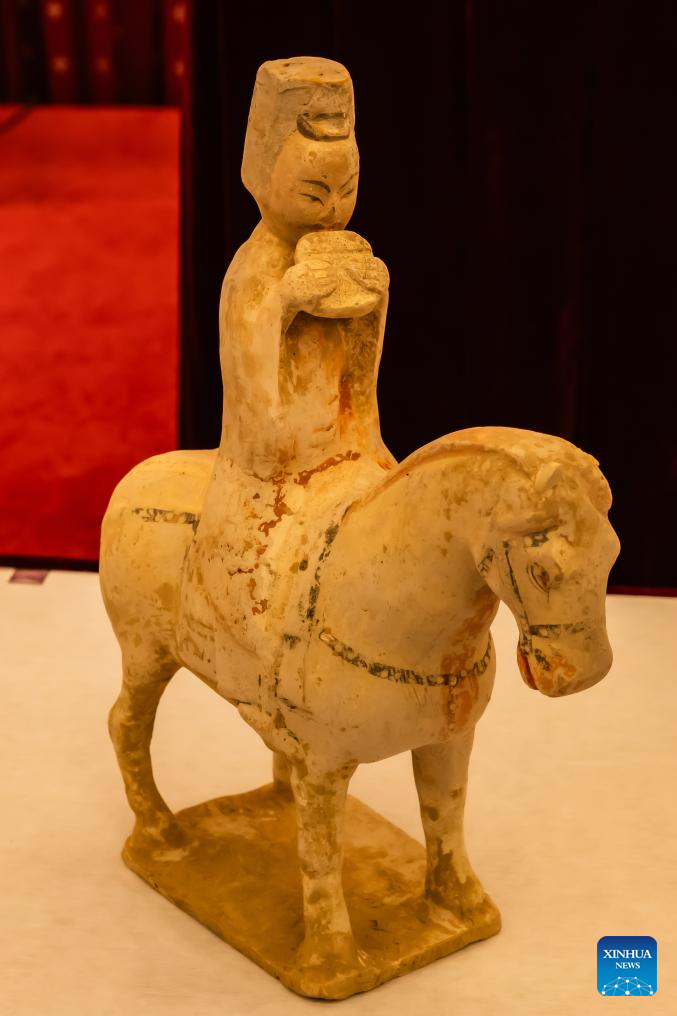 A polychrome horse and rider figurine is displayed at a handover ceremony for the repatriation of Chinese cultural objects at the Chinese embassy in Australian capital Canberra, Oct. 25, 2023. The ceremony witnessed five objects back to China. Among them, three are returned by the Australian government. (Photo by Chu Chen/Xinhua)