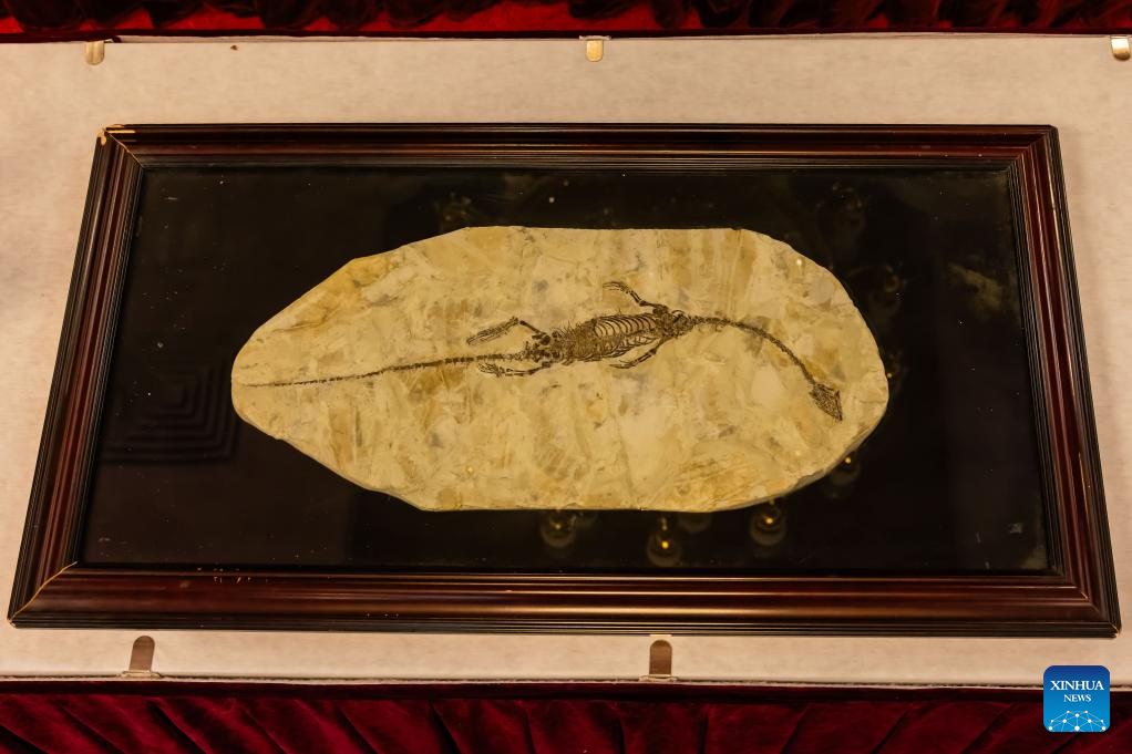 A Hyphalosaurus fossil, part of the Jehol Biota ecosystem of northeast China between 133 million and 120 million years ago, is displayed at a handover ceremony for the repatriation of Chinese cultural objects at the Chinese embassy in Australian capital Canberra, Oct. 25, 2023. The ceremony witnessed five objects back to China. Among them, three are returned by the Australian government. (Photo by Chu Chen/Xinhua)