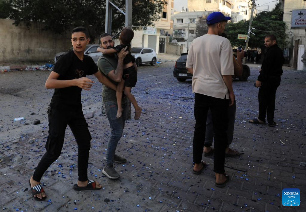 Palestinians are seen after Israeli airstrikes in Gaza City, on Oct. 25, 2023. The death toll of Palestinians from Israeli airstrikes on the Gaza Strip has risen to 6,546, said the Hamas-run Health Ministry in Gaza Strip on Wednesday. Meanwhile, 17,439 Palestinians were wounded in the coastal enclave, the ministry said in a statement. (Photo by Yasser Qudih/Xinhua)
