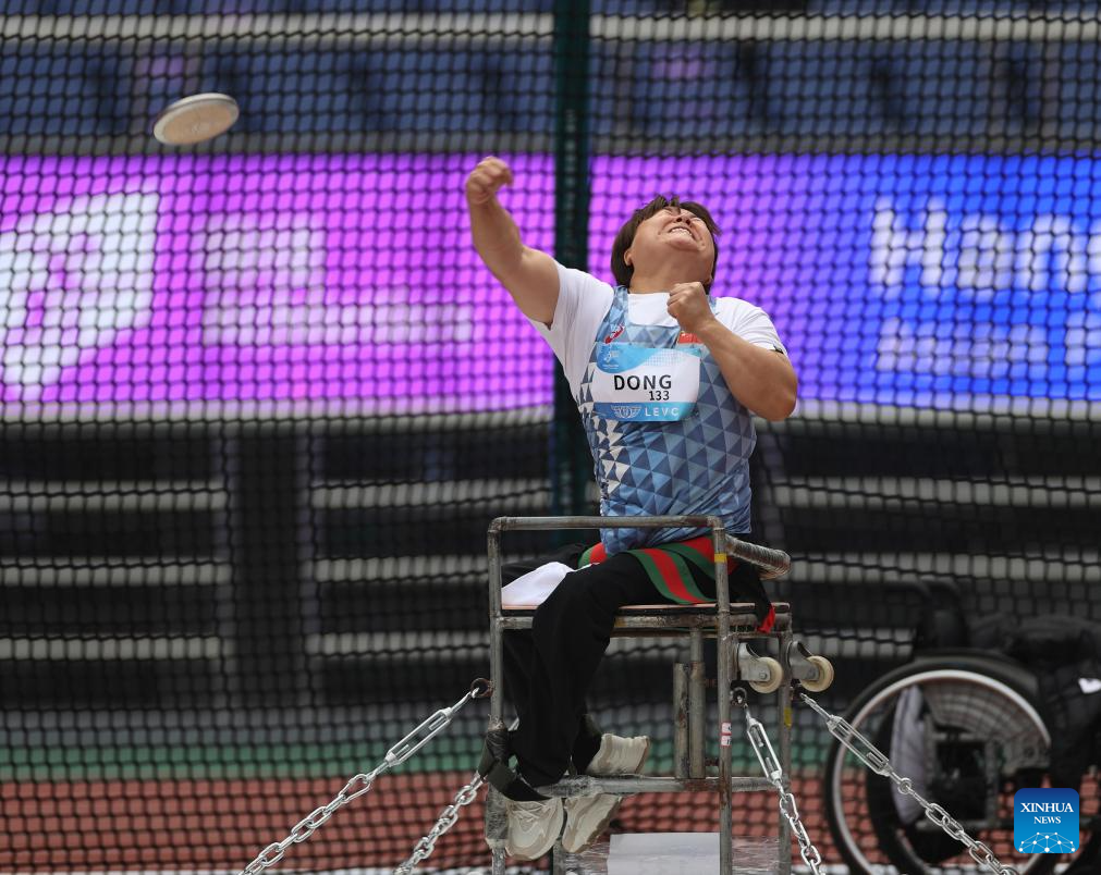 Dong Feixia of China competes during the Women's Discus Throw F54/55 final of Athletics at the 4th Asian Para Games in Hangzhou, east China's Zhejiang Province, Oct. 25, 2023. (Xinhua/Hu Xingyu)
