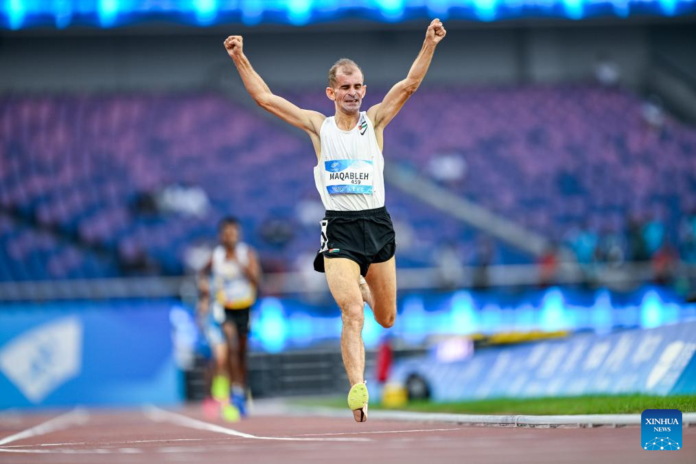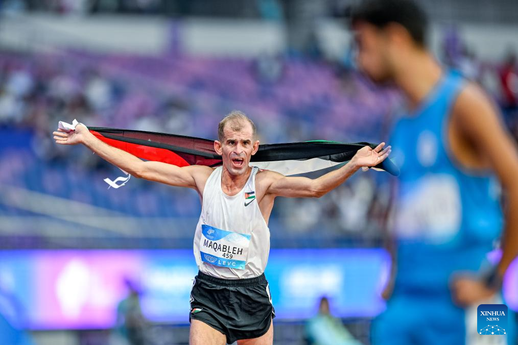 Gold medalist Nabeel Khaled Ahmad Maqableh of Jordan celebrates after winning the Men's 1500m T13 Final of Athletics at the 4th Asian Para Games in Hangzhou, east China's Zhejiang Province, Oct. 25, 2023. (Xinhua/Wu Zhizun)