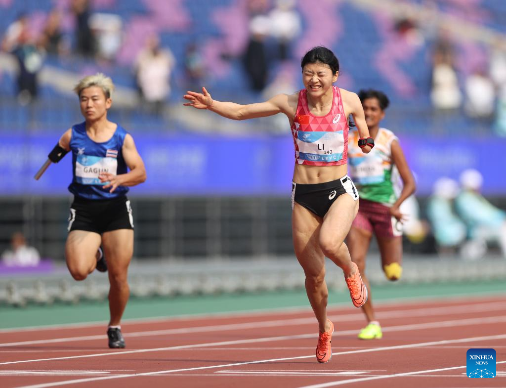 Shan Jie (C) of China competes during the Women's 100m T47 final of Athletics at the 4th Asian Para Games in Hangzhou, east China's Zhejiang Province, Oct. 25, 2023. (Xinhua/Hu Xingyu)