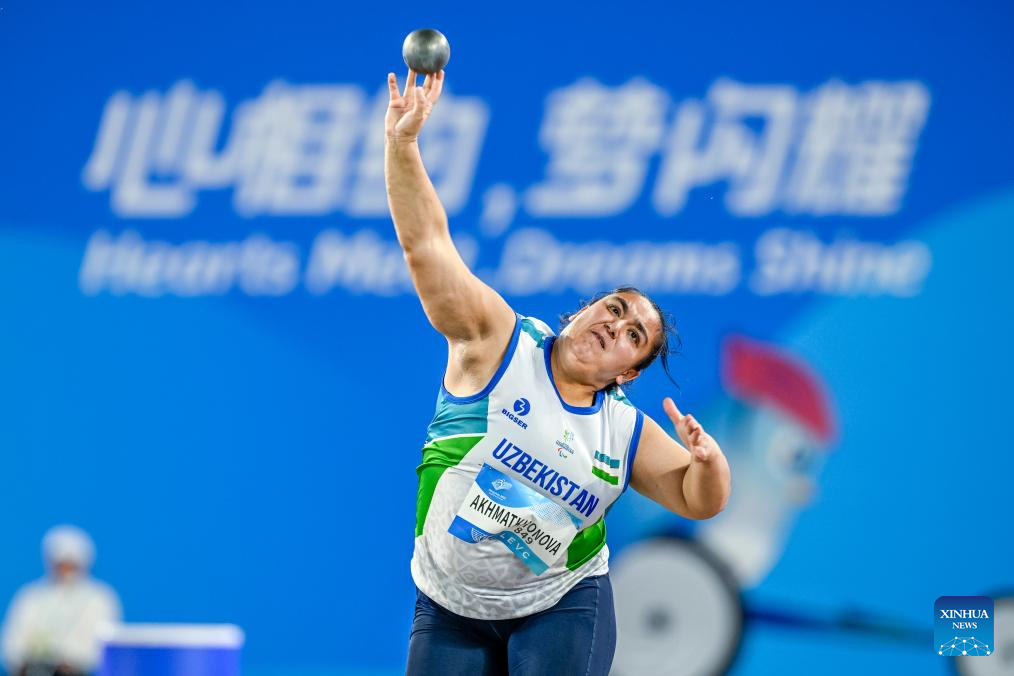 Dilafruzkhon Akhmatkhonova of Uzbekistan competes during the Women's Shot Put F35/36/37 Final of Athletics at the 4th Asian Para Games in Hangzhou, east China's Zhejiang Province, Oct. 25, 2023. (Xinhua/Wu Zhizun)