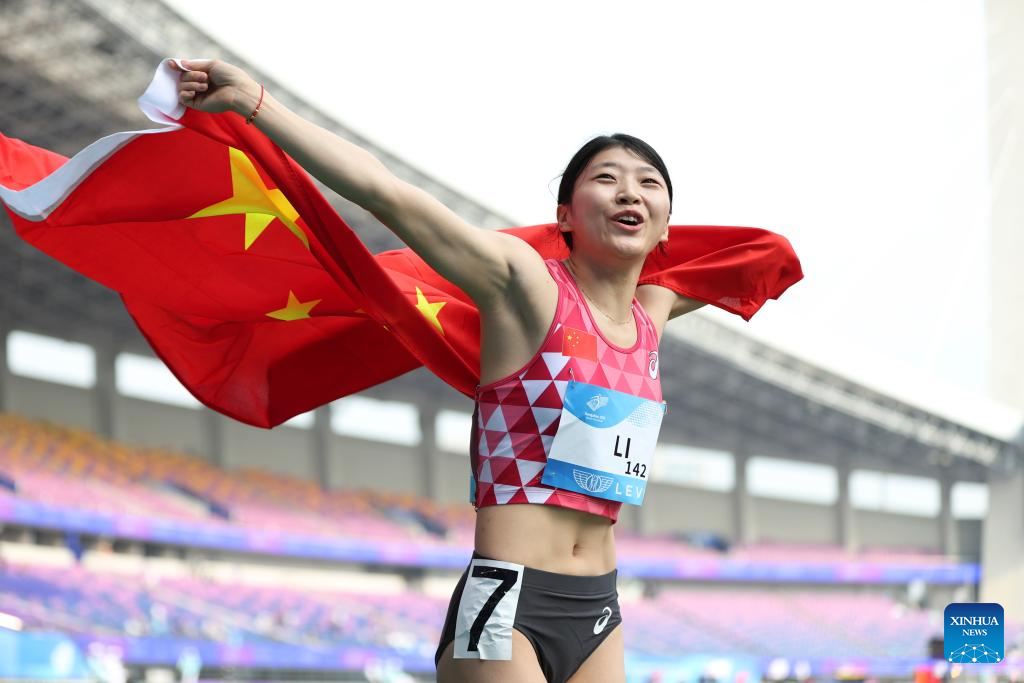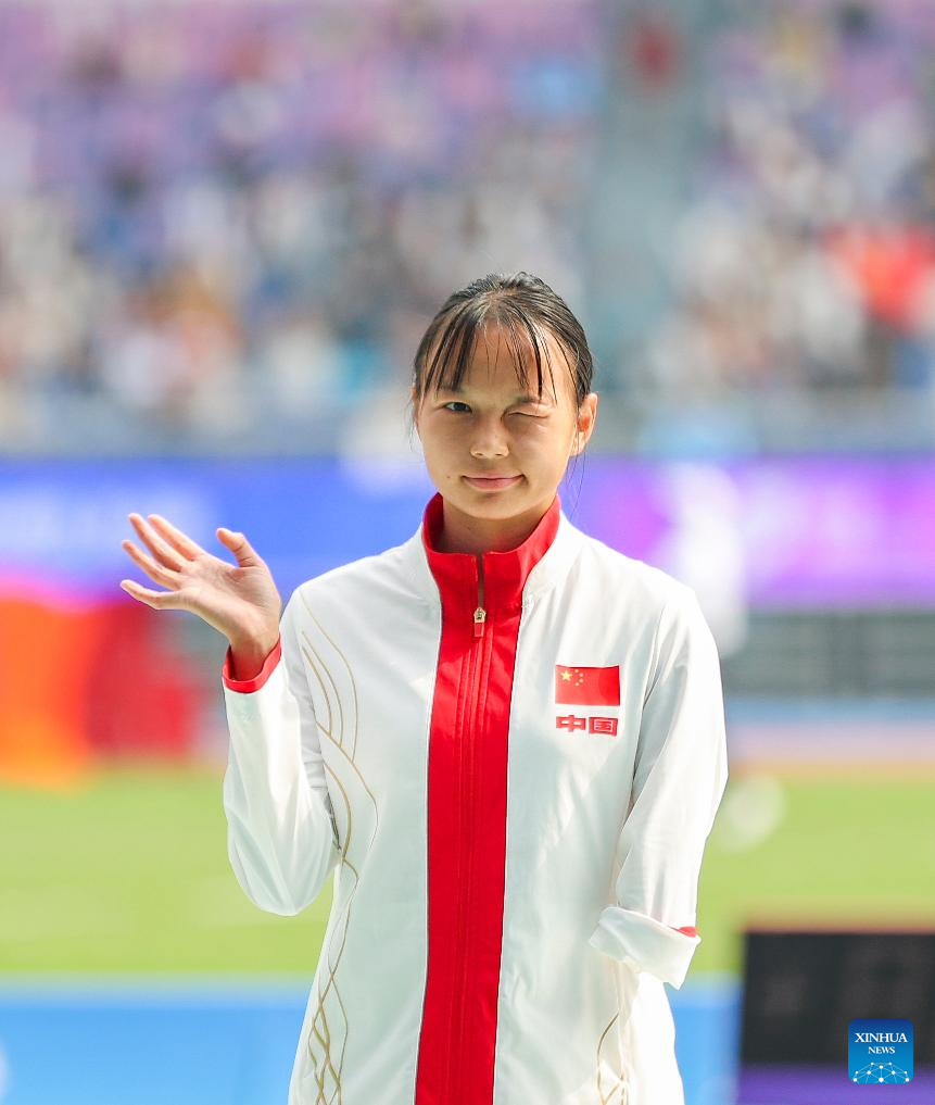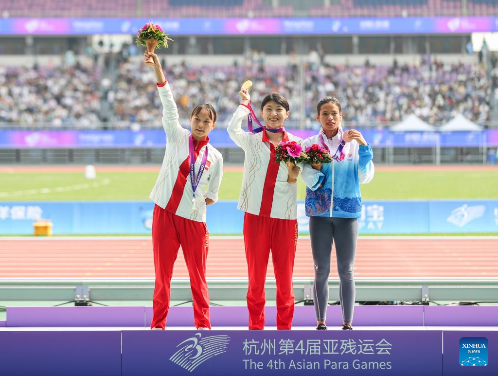Shan Jie of China attends the awarding ceremony for the Women's 100m T47 of Athletics at the 4th Asian Para Games in Hangzhou, east China's Zhejiang Province, Oct. 25, 2023. (Xinhua/Hu Xingyu)