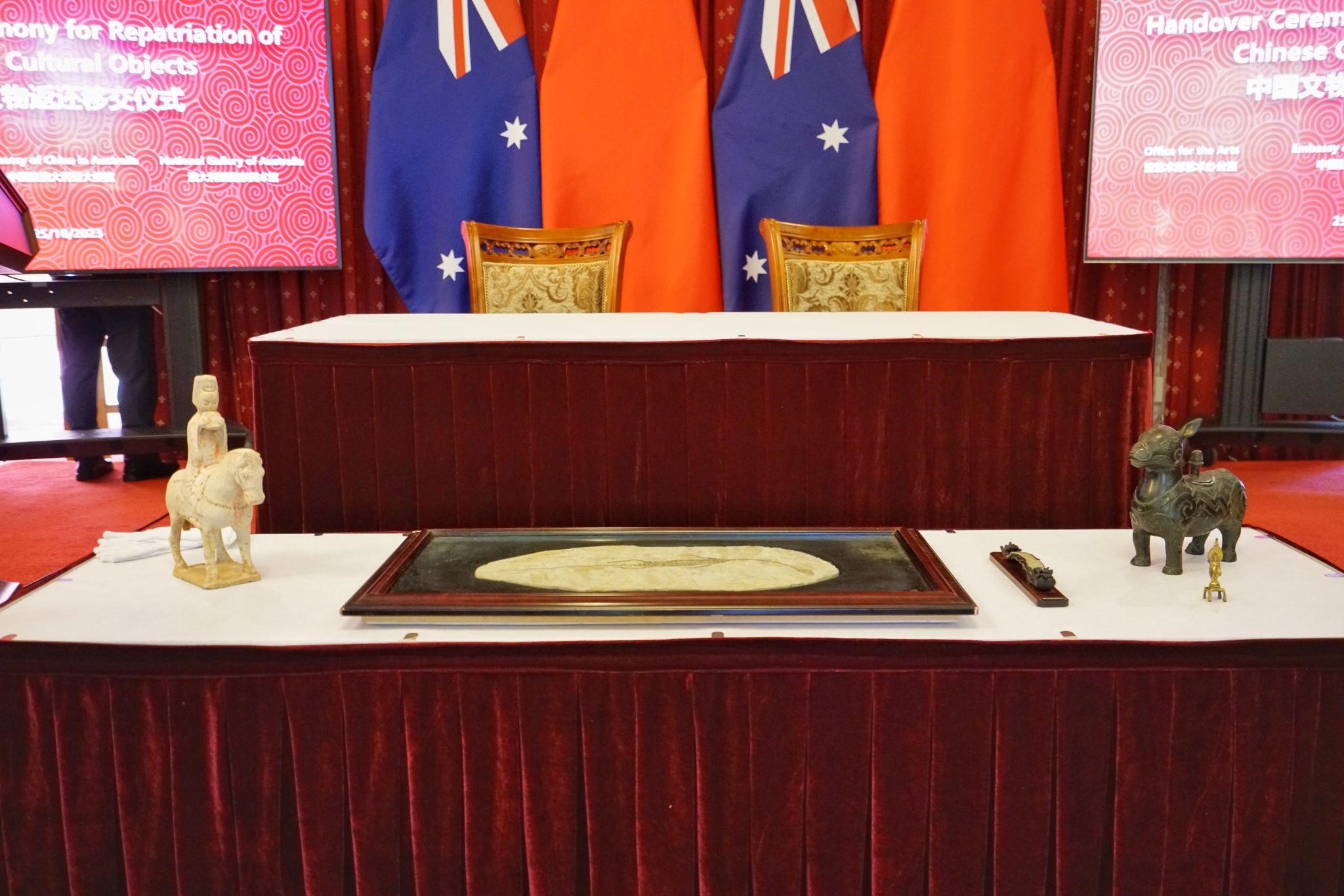 A total of four Chinese cultural objects and one fossil were returned from Australia to China during an official handover ceremony at the Chinese Embassy in Canberra on Oct. 25, 2023.