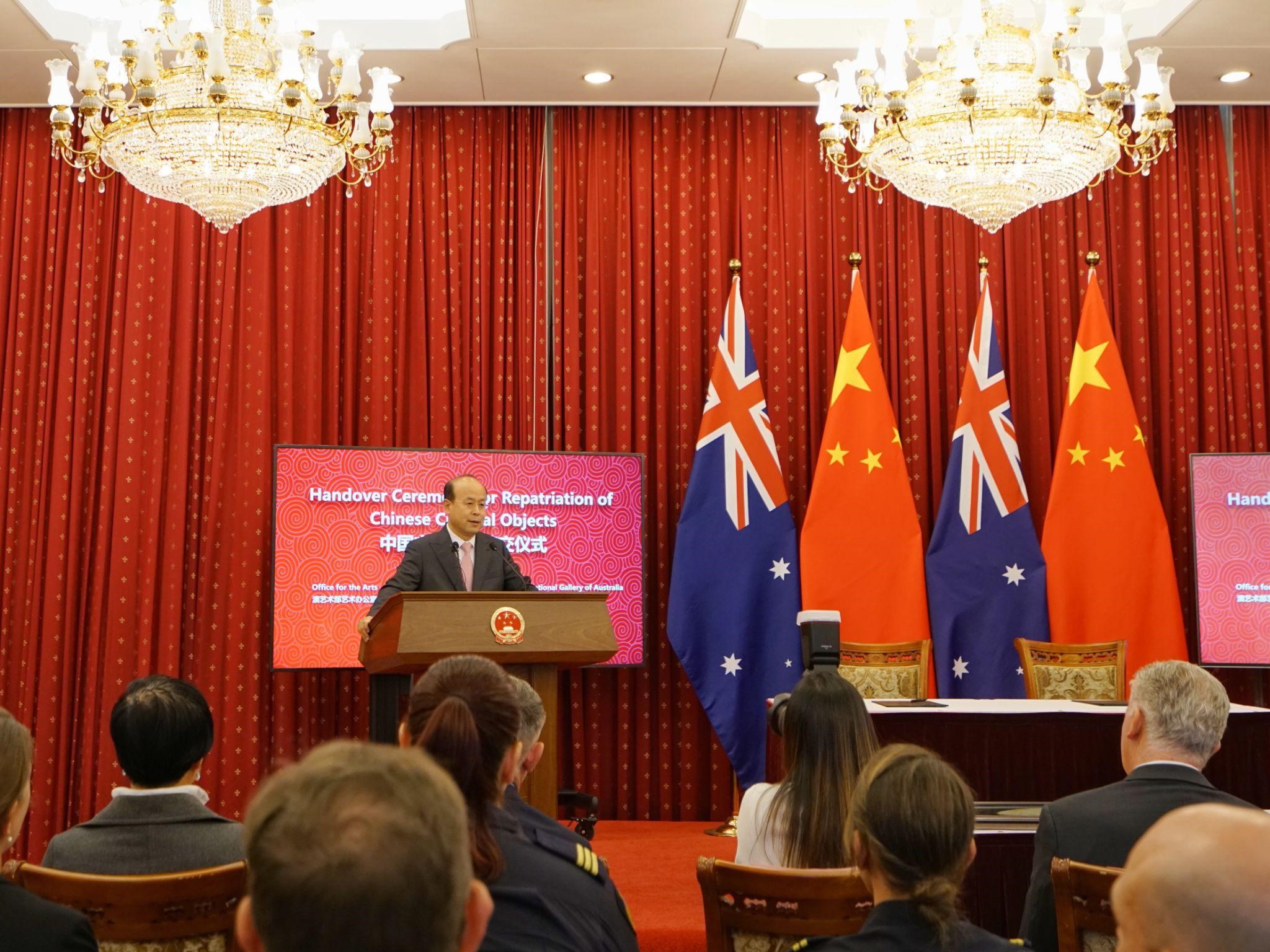 Chinese Ambassador to Australia Xiao Qian delivers a speech at the Handover Ceremony for Repatriation of Chinese Cultural Objects in Canberra, the capital of Australia, Oct. 25, 2023. (Photo/Zhengzheng Huang)