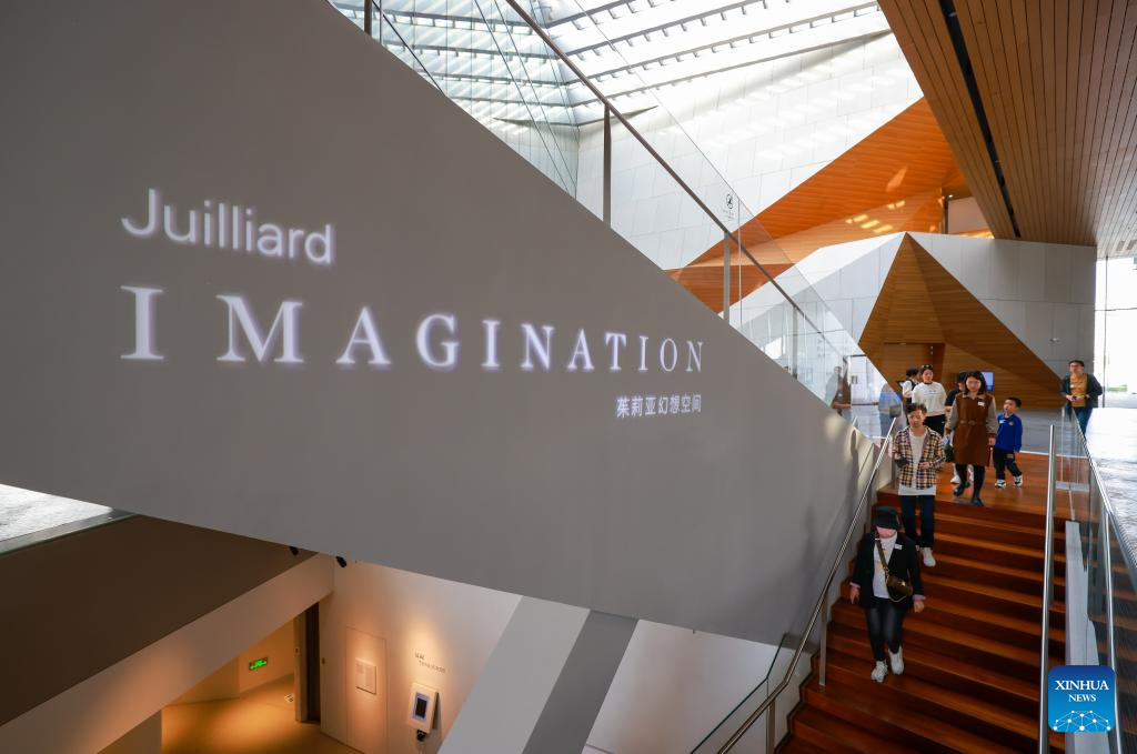 People visit the Juilliard Imagination exhibition held by the Tianjin Juilliard School in north China's Tianjin, Oct. 25, 2023. The Juilliard Imagination exhibition provides the visitors with rich displays of music, dance, and drama through audio and visual interactive experiences. (Xinhua/Sun Fanyue)