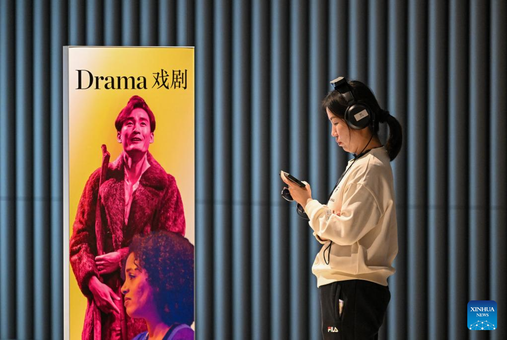 A visitor watches a play through an interactive device at the Juilliard Imagination exhibition held by the Tianjin Juilliard School in north China's Tianjin, Oct. 25, 2023. The Juilliard Imagination exhibition provides the visitors with rich displays of music, dance, and drama through audio and visual interactive experiences. (Xinhua/Sun Fanyue)