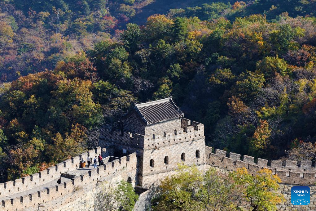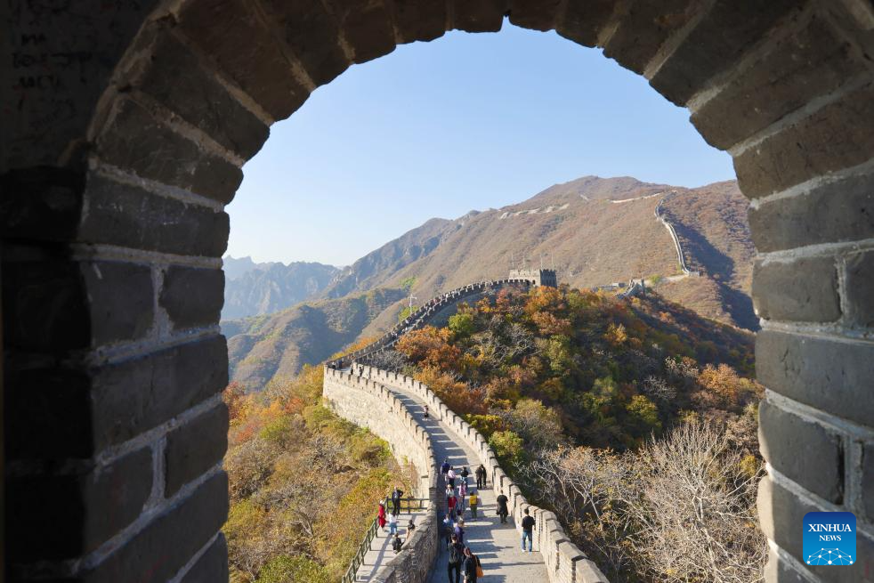 Visitors enjoy the autumn scenery of the Mutianyu section of the Great Wall in Beijing, capital of China, Oct. 26, 2023. (Xinhua/Xing Guangli)