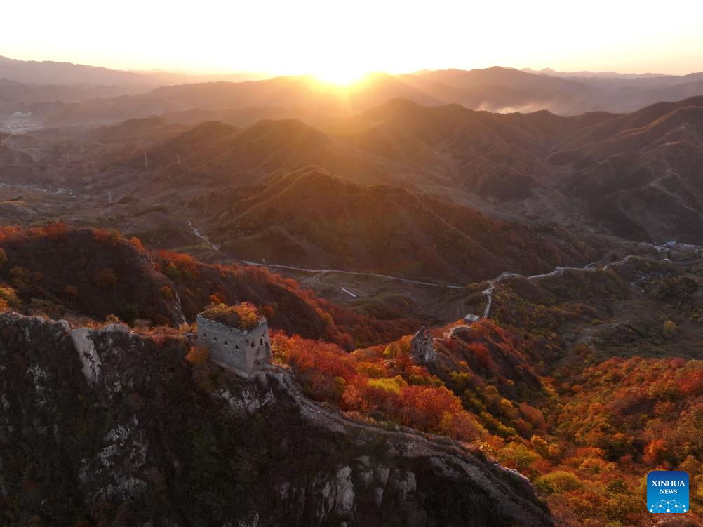 This aerial photo taken on Oct. 26, 2023 shows the autumn scenery of Qingshanguan Great Wall in Qianxi County of Tangshan, north China's Hebei Province. (Photo by Wang Aijun/Xinhua)