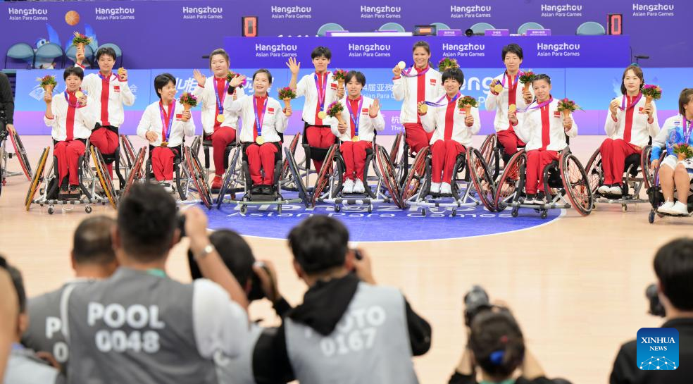 Players of China pose for photos during the awarding ceremony after the Women's Gold Medal Match of the Wheelchair Basketball between China and Japan at the 4th Asian Para Games in Hangzhou, east China's Zhejiang Province, Oct. 26, 2023. (Xinhua/Cai Yang)