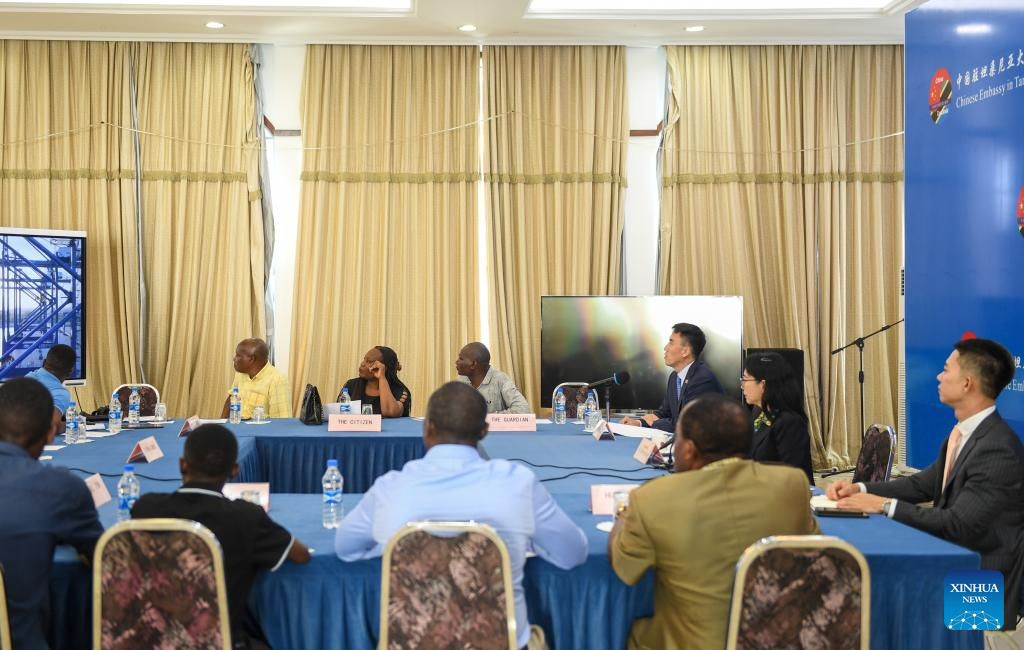 The Chinese Ambassador to Tanzania Chen Mingjian (2nd R) introduces the outcomes of the Third Belt and Road Forum for International Cooperation held in Beijing last week during a press briefing in Dar es Salaam, Tanzania, on Oct. 26, 2023. Chen Mingjian announced on Thursday that China intends to continue promoting Belt and Road cooperation with Tanzania, jointly advancing toward a better future of modernization. (Xinhua/Li Yahui)