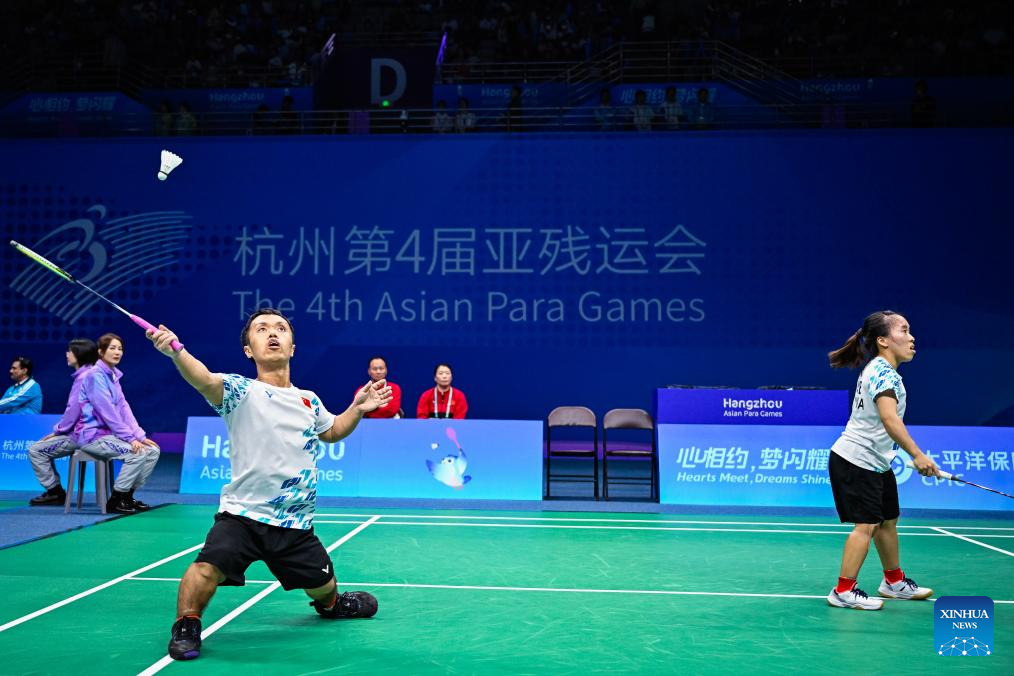 Zeng Qingtao(L)/Lin Shuangbao of China compete during the Mixed Doubles SH6 final of Badminton against Rina Marlina/Subhan of Indonesia at the 4th Asian Para Games in Hangzhou, east China's Zhejiang Province, Oct. 26, 2023. (Xinhua/Wu Zhizun)