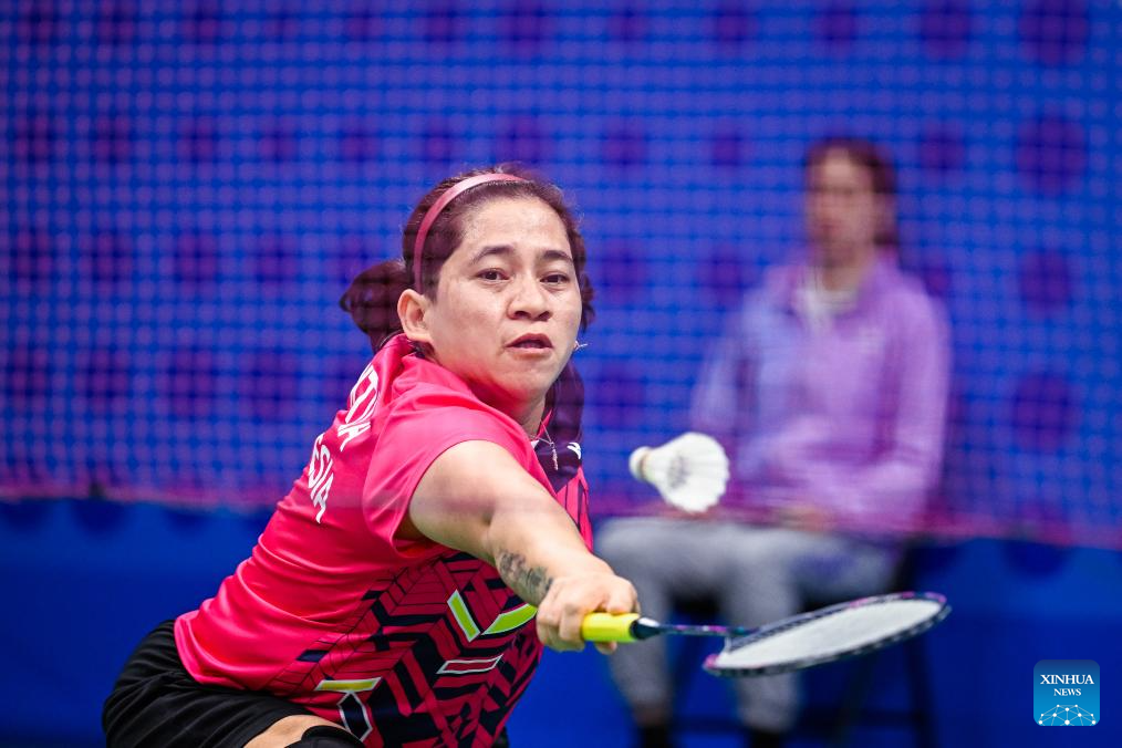 Leani Ratri Oktila of Indonesia hits a return during the Women's Singles SL4 Final of Badminton against Cheng Hefang of China at the 4th Asian Para Games in Hangzhou, east China's Zhejiang Province, Oct. 26, 2023. (Xinhua/Wu Zhizun)