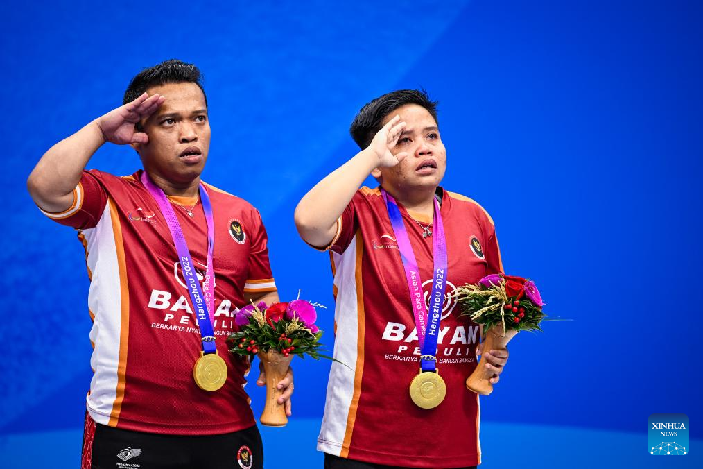 Gold medalists Rina Marlina(R)/Subhan of Indonesia salute during the awarding ceremony of Mixed Doubles SH6 event of Badminton at the 4th Asian Para Games in Hangzhou, east China's Zhejiang Province, Oct. 26, 2023. (Xinhua/Wu Zhizun)