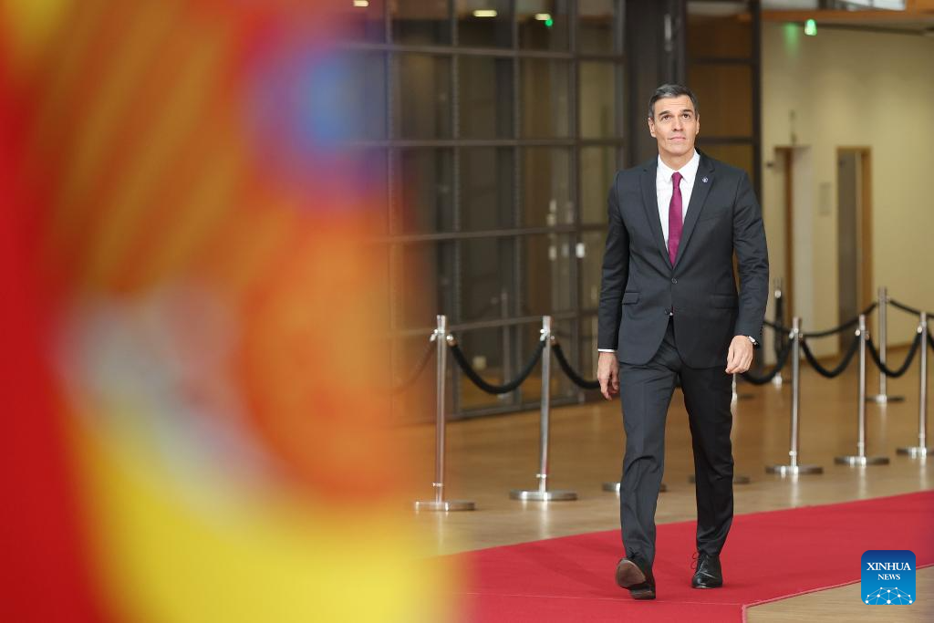 Spain's acting Prime Minister Pedro Sanchez arrives for the EU summit in Brussels, Belgium, on Oct. 26, 2023. European Union (EU) leaders meet here on Thursday and Friday in a planned European Council summit, focusing on the conflicts between Israel and Hamas and between Ukraine and Russia. (Xinhua/Zhao Dingzhe)