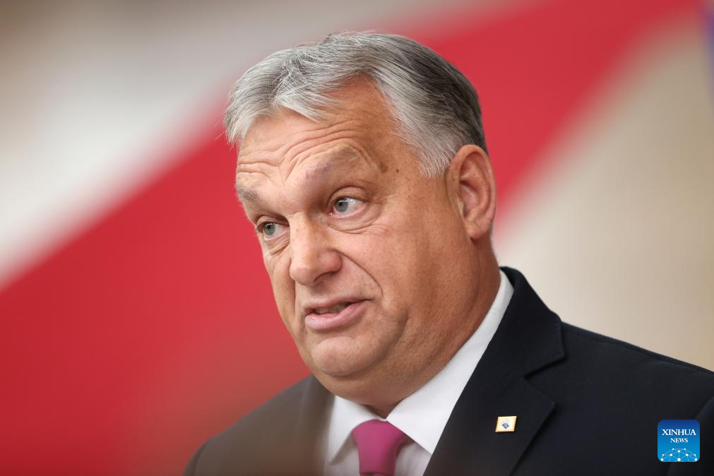Hungarian Prime Minister Viktor Orban speaks to media as he arrives for the EU summit in Brussels, Belgium, on Oct. 26, 2023. European Union (EU) leaders meet here on Thursday and Friday in a planned European Council summit, focusing on the conflicts between Israel and Hamas and between Ukraine and Russia. (Xinhua/Zhao Dingzhe)