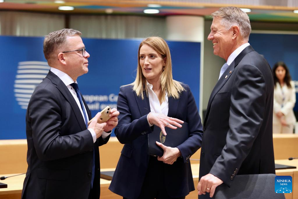 Finnish Prime Minister Petteri Orpo (L), President of the European Parliament Roberta Metsola (C) and President of Romania Klaus Werner Iohannis (R) talk during the EU summit in Brussels, Belgium, on Oct. 26, 2023. European Union (EU) leaders meet here on Thursday and Friday in a planned European Council summit, focusing on the conflicts between Israel and Hamas and between Ukraine and Russia. (Xinhua/Zhao Dingzhe)