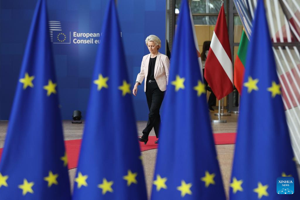 President of the European Commission Ursula von der Leyen arrives for the EU summit in Brussels, Belgium, on Oct. 26, 2023. European Union (EU) leaders meet here on Thursday and Friday in a planned European Council summit, focusing on the conflicts between Israel and Hamas and between Ukraine and Russia. (Xinhua/Zhao Dingzhe)