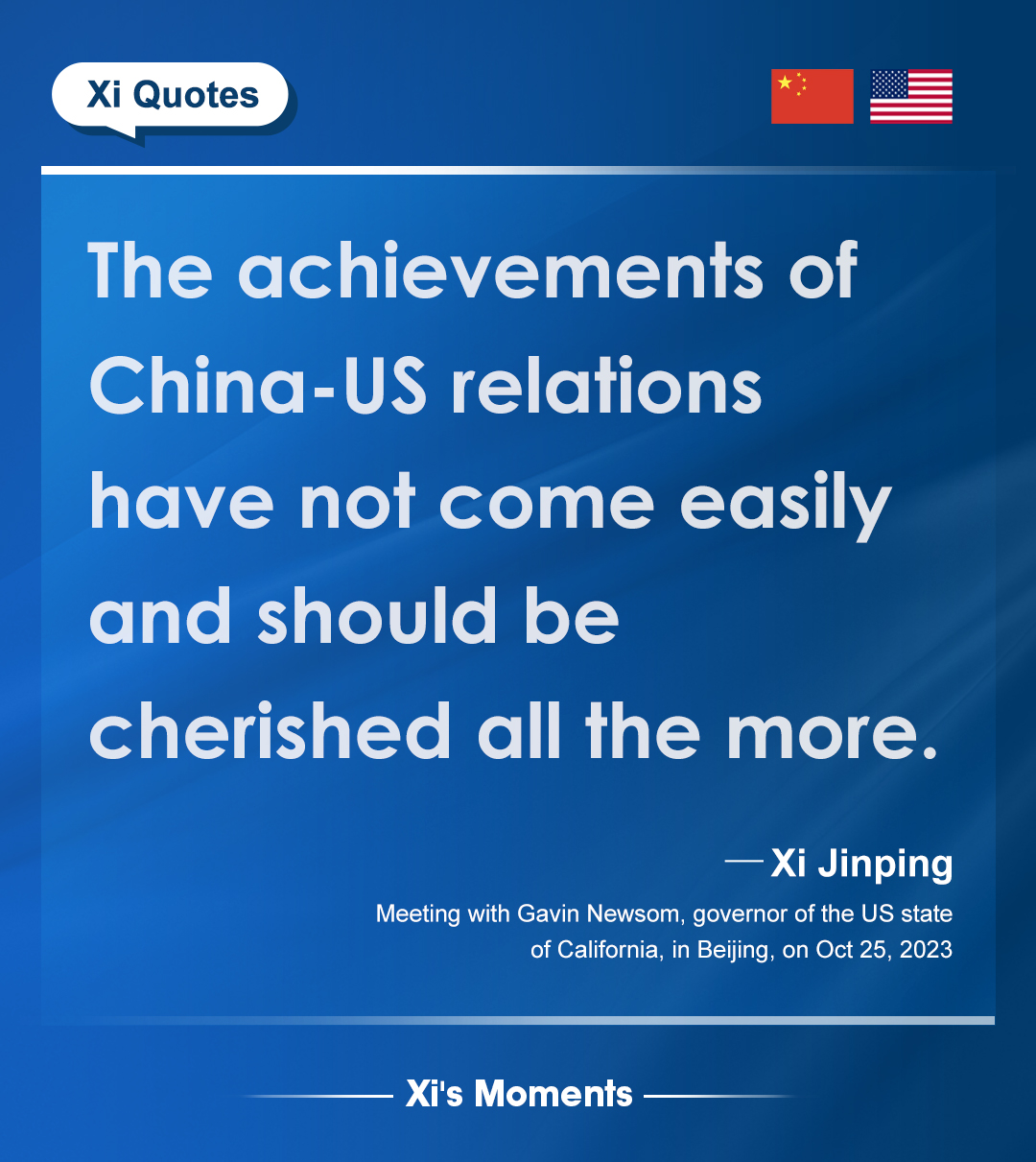 President Xi Jinping met with the governor of the US state of California on Wednesday to reaffirm Beijing's commitment to stronger bilateral ties amid growing diplomatic engagements between the two countries. Here are the highlights of his remarks.