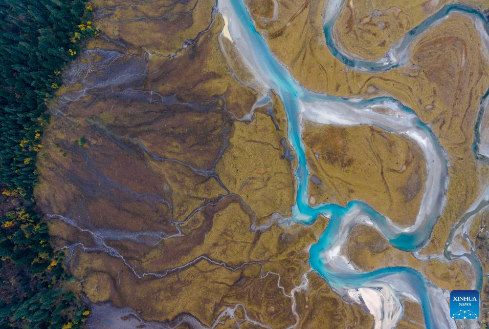 This aerial photo taken on Oct. 28, 2023 shows the autumn scenery in Gongbo'Gyamda County in Nyingchi City, southwest China's Tibet Autonomous Region. (Xinhua/Jiang Fan)