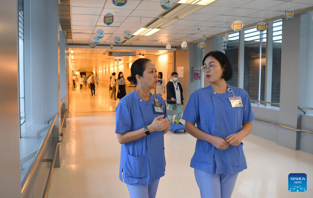 Liu Jiali (L) and Savina Sze work in a ward at Prince of Wales Hospital in south China's Hong Kong, Oct. 18, 2023. (Xinhua/Chen Duo)