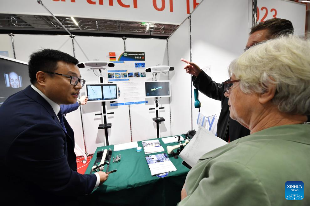 A staff member (L) of China's National Clinical Research Center for Orthopedics, Sports Medicine &Rehabilitation introduces an intelligent surgical navigation system to visitors at the 75th international inventors' trade fair in Nuremberg, Germany, Oct. 28, 2023.