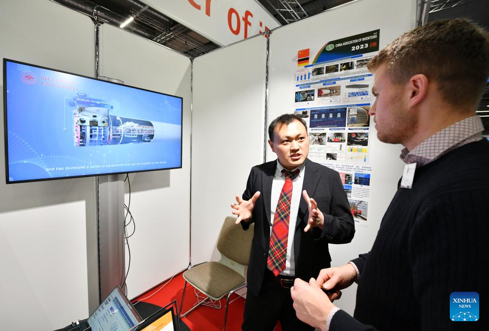 A staff member (L) of Shandong University introduces an intelligent shield-tunneling system to a visitor at the 75th international inventors' trade fair in Nuremberg, Germany, Oct. 28, 2023.