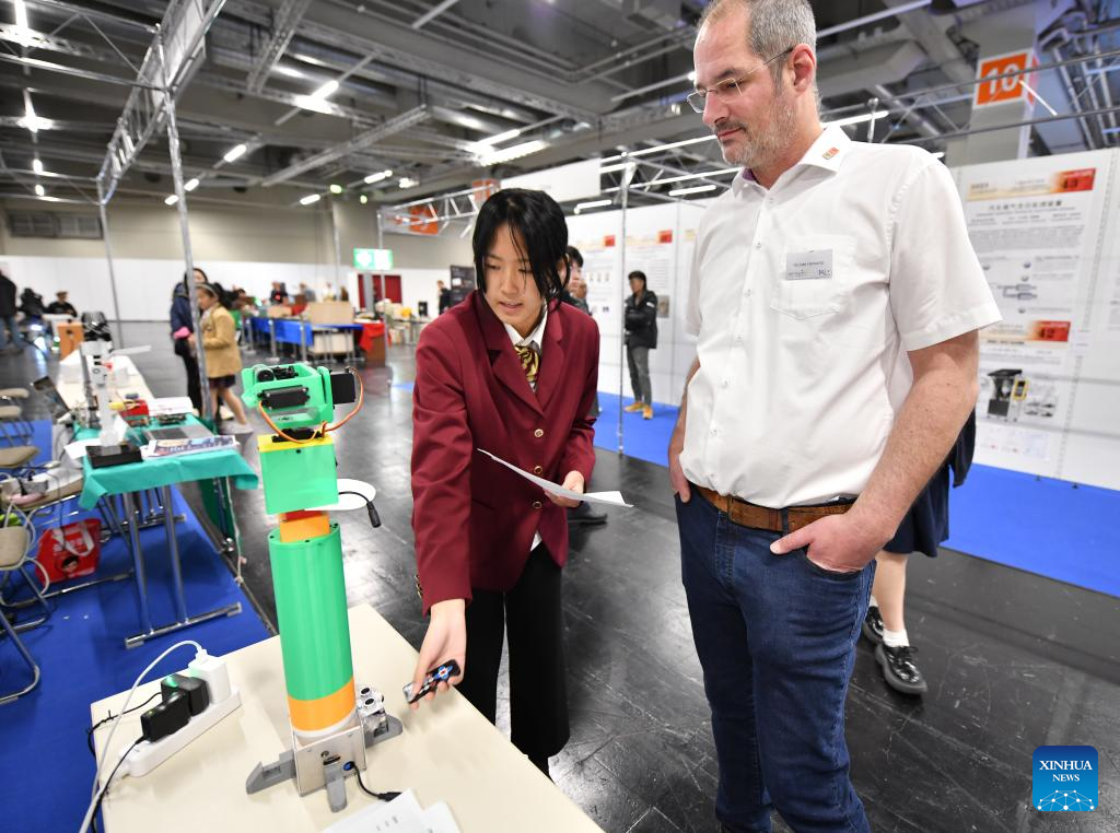 A student (L) from Beijing No. 80 High School introduces the prototype of a self-stabilizing tripod to a visitor at the 75th international inventors' trade fair in Nuremberg, Germany, Oct. 28, 2023.