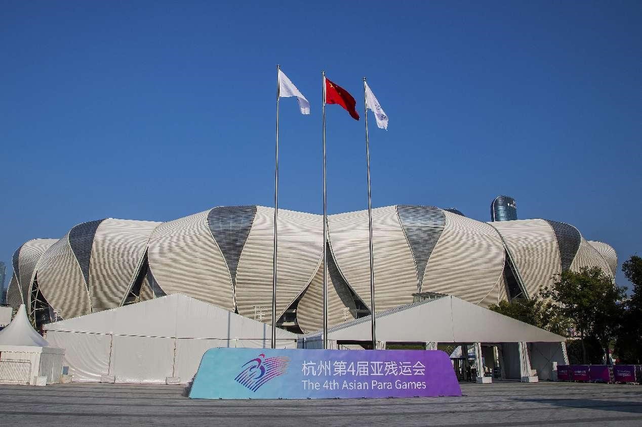Photo shows a sign of the 4th Asian Para Games outside the Hangzhou Olympic Sports Center Stadium. (People's Daily Online/Xu Kunde)