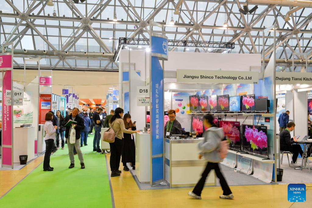 A visitor checks exhibits during the 7th China Commodity Fair in Moscow, Russia, on Oct. 30, 2023. This event is held here from Oct. 30 to Nov. 1. (Photo by Alexander Zemlianichenko Jr/Xinhua)