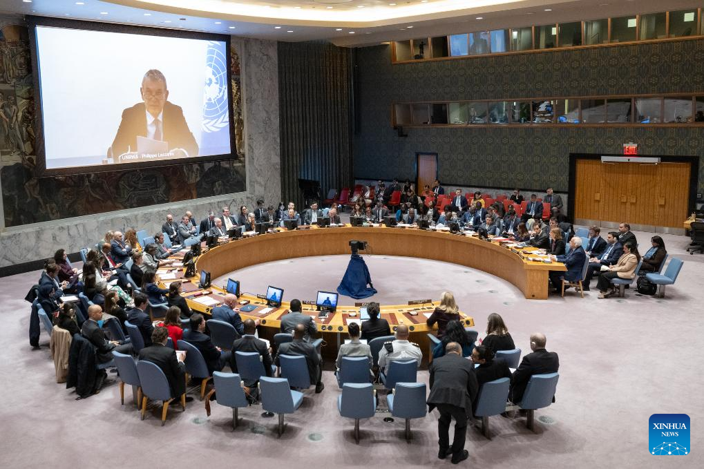 Philippe Lazzarini (on the screen), the commissioner-general of the UN Agency for Palestine Refugees (UNRWA), speaks at a UN Security Council meeting via a video link at the UN headquarters in New York, on Oct. 30, 2023. (Eskinder Debebe/UN Photo/Handout via Xinhua)