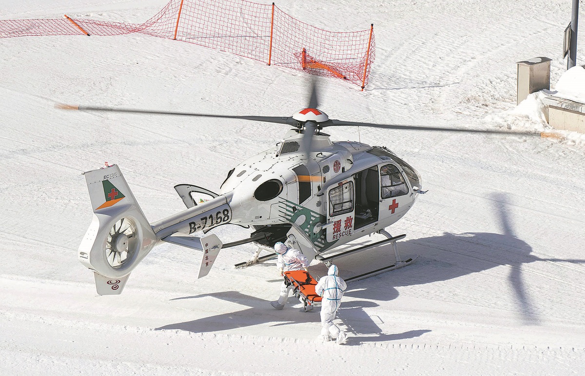 Rescue personnel practice transferring an injured athlete during a rescue drill for the Beijing Winter Olympic Games on March 3 last year. [Photo by Feng Yongbin/China Daily]