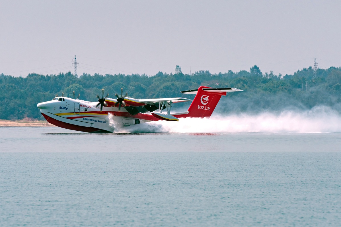 An AG600M amphibious aircraft tests its water-collection function in Jingmen, Hubei province, on Sept 25 last year. [Photo by Yue Shuhua/For China Daily]
