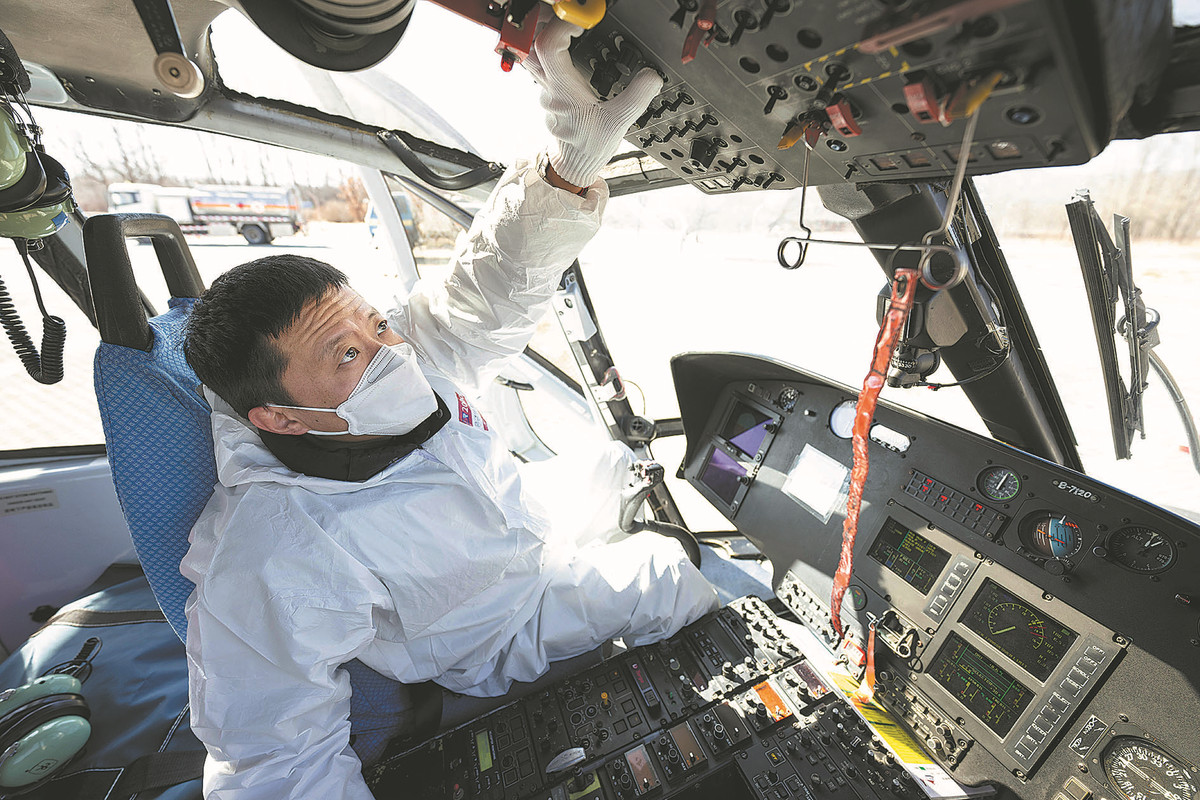 A pilot checks the status of a search and rescue helicopter before taking off during the Beijing 2022 Winter Olympic Games in Beijing on March 1 last year. [Photo by Feng Yongbin/China Daily]