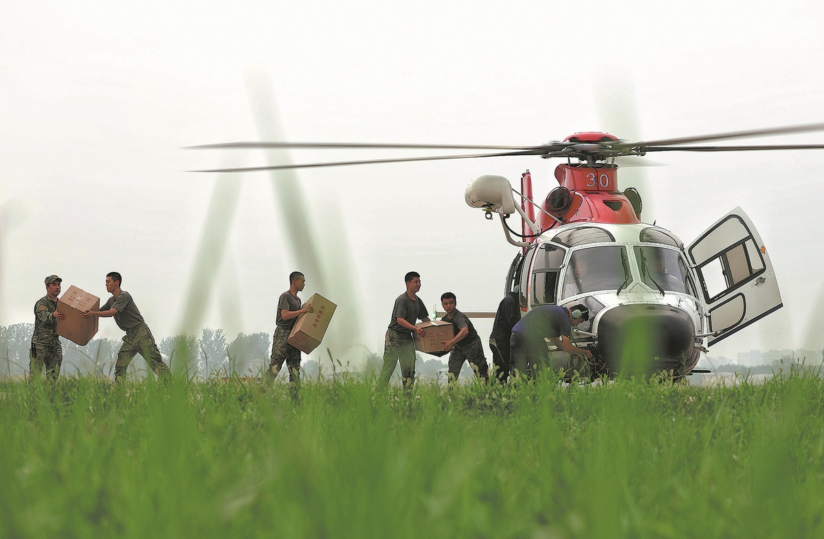 Supplies are loaded by rescuers onto a helicopter for delivery to Zhuozhou, Hebei province, which was hit by heavy rain on Aug 3. [Photo by Tao Ran/For China Daily]
