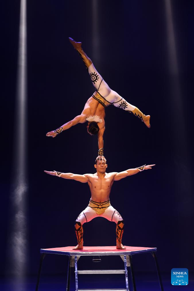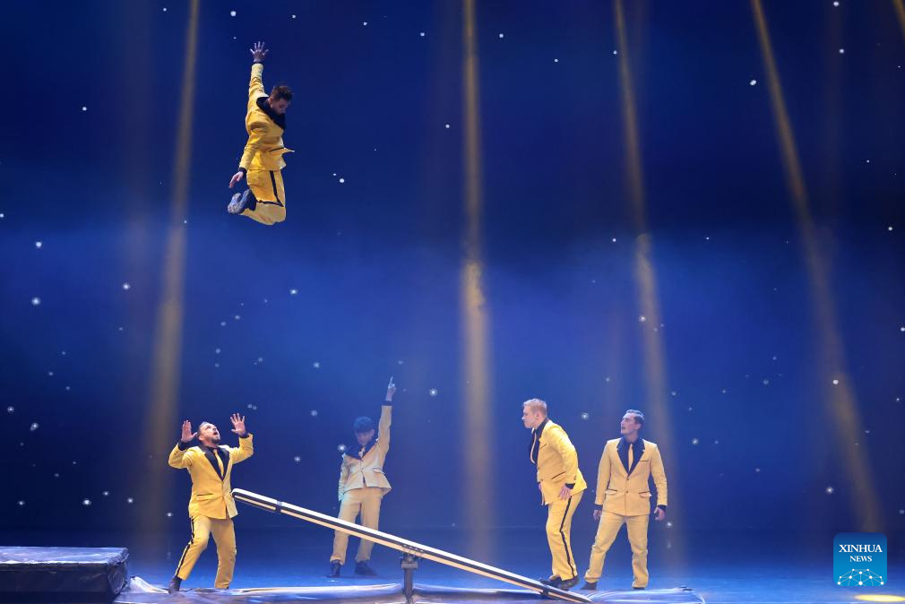 Acrobats perform during the closing ceremony of the 19th China Wuqiao International Circus Festival in Cangzhou, north China's Hebei Province, Oct. 30, 2023. (Xinhua/Luo Xuefeng)