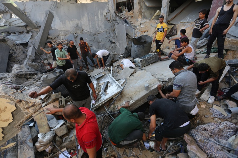 People search for survivors among the rubble of buildings destroyed in Israeli airstrikes in the southern Gaza Strip city of Rafah, on Oct. 31, 2023. (Photo by Khaled Omar/Xinhua)