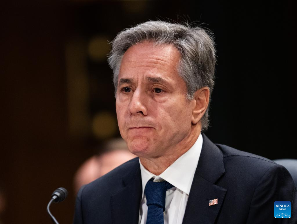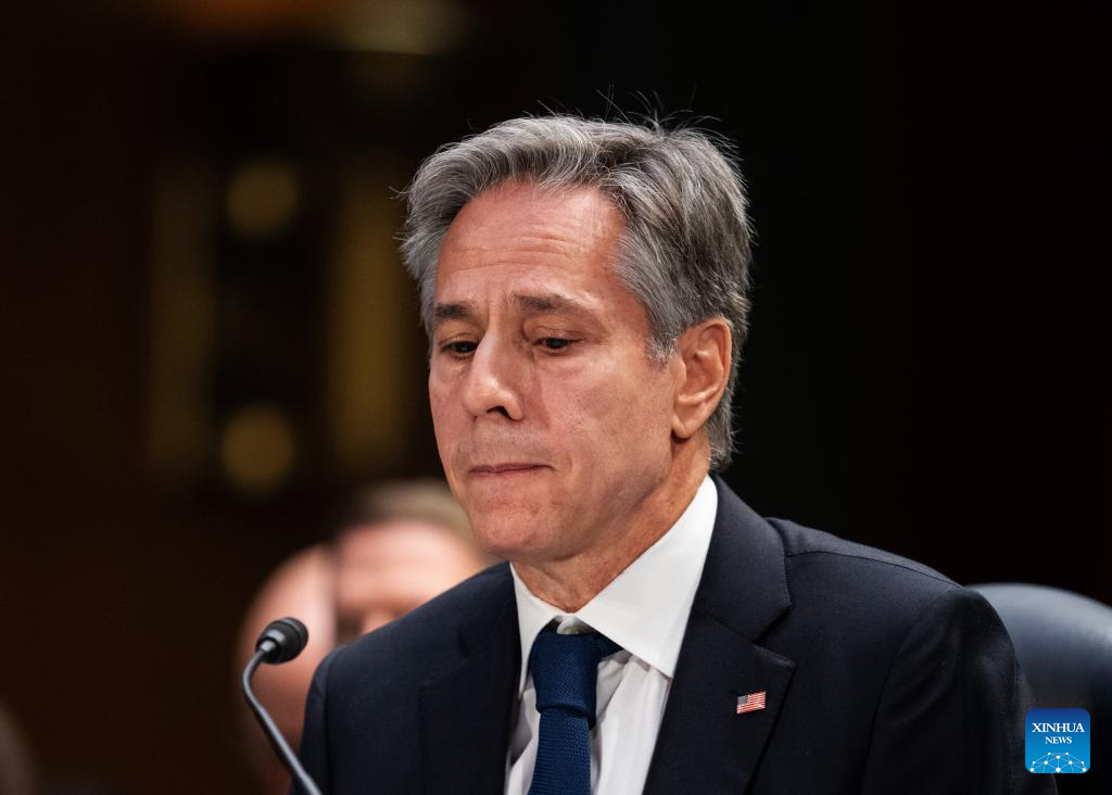 U.S. Secretary of State Antony Blinken attends a hearing before the Senate Appropriations Committee in Washington, D.C., the United States, on Oct. 31, 2023. Multiple protesters demanding an immediate ceasefire in the Gaza Strip repeatedly interrupted a hearing held by the U.S. Senate on the Joe Biden administration's massive budget request for funding Israel and Ukraine in their respective conflicts. (Xinhua/Liu Jie)