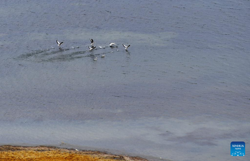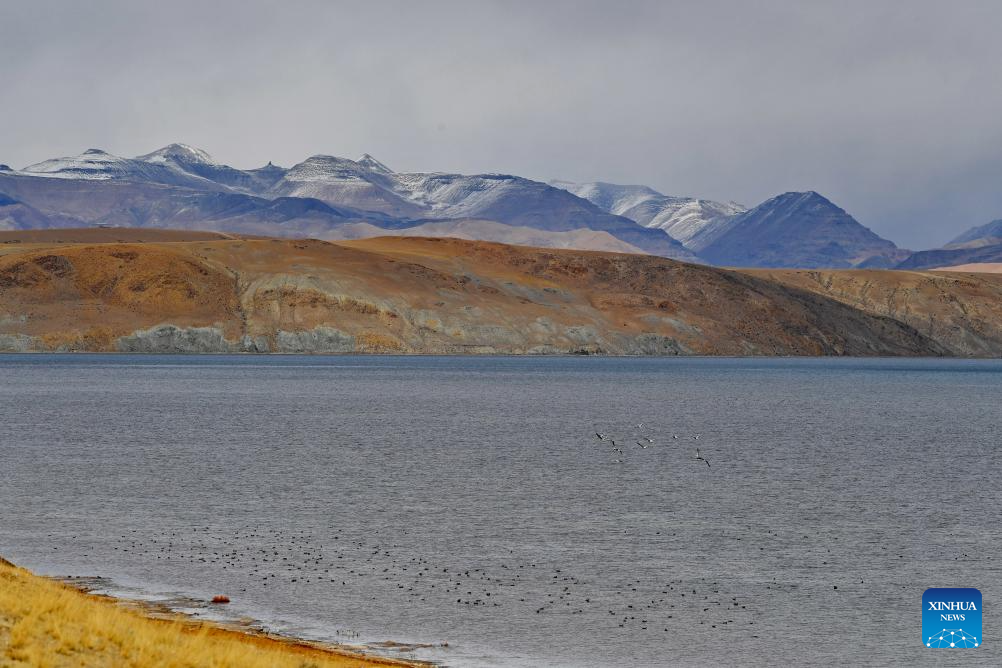 This photo taken on Oct. 29, 2023 shows bar-headed geese on the Mapam Yumco Lake in Burang County of Ngari Prefecture, southwest China's Tibet Autonomous Region. (Xinhua/Zhang Rufeng)