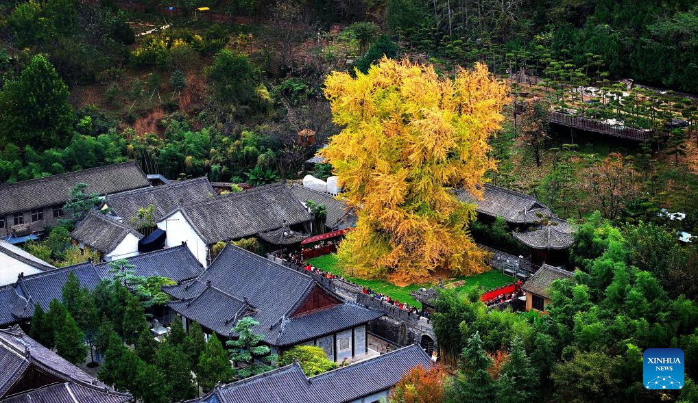 This aerial photo taken on Oct. 31, 2023 shows a ginkgo tree in a temple in Xi'an, northwest China's Shaanxi Province. (Xinhua/Liu Xiao)