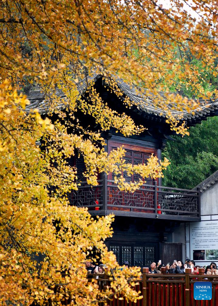 Visitors look at a ginkgo tree in a temple in Xi'an, northwest China's Shaanxi Province, Oct. 31, 2023. (Xinhua/Liu Xiao)