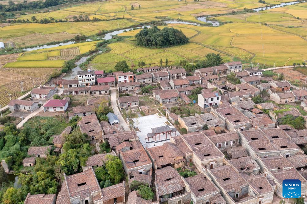 This aerial photo taken on Oct. 30, 2023 shows the autumn view of Chenghu Village, Jinxi County, Fuzhou City, east China's Jiangxi Province. (Photo by Deng Xingdong/Xinhua)